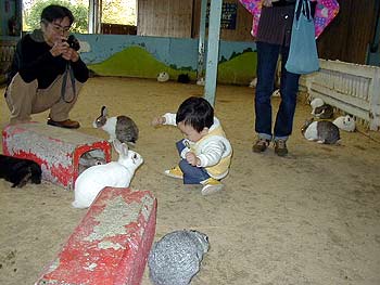 ウサギと戯れる、ヨッシ〜。