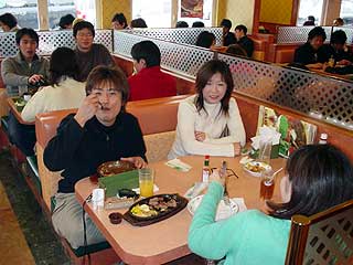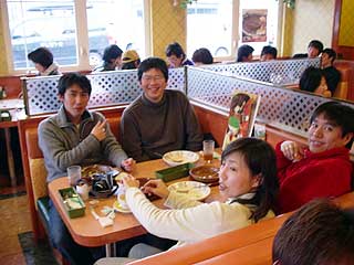 人数が多いので、みんな別々のテーブルで食べてます。 |