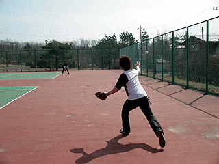 朝なのに、テニスコートでキャッチボールや初テニスをやったのだ。翌日、筋肉痛は言うまでもない・・・(爆) |